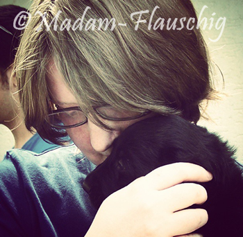 Von dem Züchter, wurden wir direkt in den Garten geführt wo uns die Liebevolle Mutter der Welpen Schwanz wedelnd begrüßte. Es gab braune und auch schwarze Welpen, doch waren nur noch 3 schwarze Rüden zur Auswahl. Der Züchter ging zu dem Gartenhäuschen und holte die 3 die noch übrig war. Was in dem Augenblick passierte hätte ich nicht gedacht, den ich suchte mir nicht den Welpen aus, sondern in dem Augenblick, als er mit entgegen gelaufen kam und fast selber über seine Füße stolperte, verzauberte Haydn mich von dem ersten Augenblick. Nie hätte ich gedacht, dass man sich so schnell in so ein kleines Fellkneul verlieben könnte, den ab diesen Augenblick hatte ich nur noch Augen für ihn. Dann nahm ich ihn auf den Arm und mein Herz gehörte ab diesen Augenblick nur noch diesem Welpen. Natürlich nahm ich ihn und heute, würde ich ihn für nichts auf der Welt mehr her geben. Wir sind ein Team eine Einheit. Heute sage ich, dass er mich ausgesucht hat, oder er mir von jemanden geschickt wurde, den auf so viele Arten hilft er mir durch Leben und zeigt mir, dass es sich lohnt für etwas zu kämpfen. Sicher musste ich am Anfang noch alle 2 Stunden mit ihm nach draußen, damit das Geschäft von ihm auch wirklich nicht drinnen landete, dennoch hat sich diese Mühe voll und ganz gelohnt. Das tägliche Training beweist mir auch, dass wir zusammen auf den richtigen Weg sind. In unserem Leben wird noch einiges passieren und wir haben auch noch Arbeit vor uns, dennoch passen wir perfekt zusammen und werden dies gemeinsam schaffen.